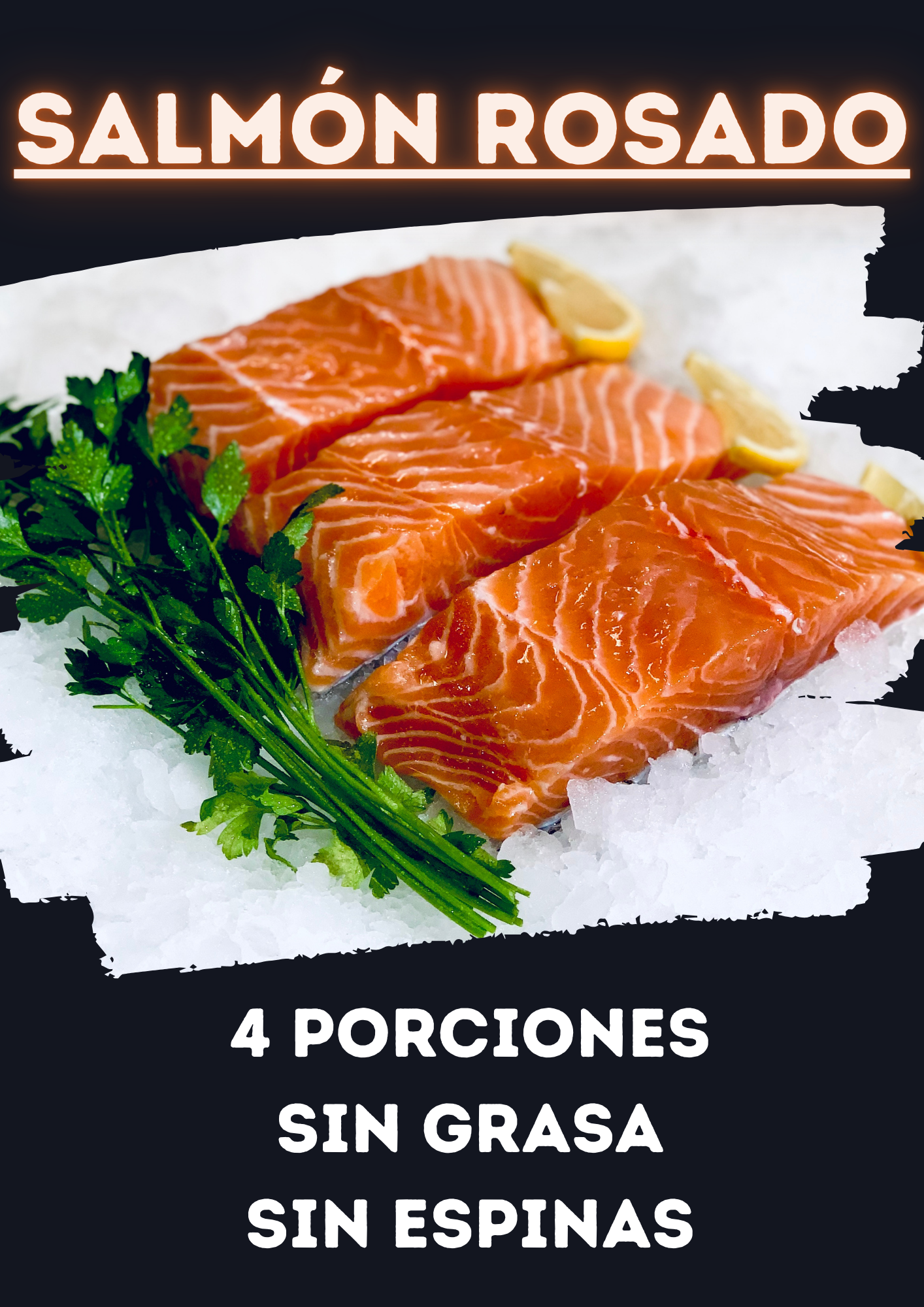 Cuatro porciones individuales de 250 g cada una, seleccionadas del lomo del salmón, pareja en grosor y textura.